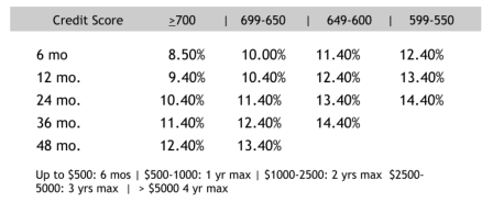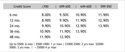 Up to $500: 6 mos | $500-1000: 1 yr max | $1000-2500: 2 yrs max $2500-